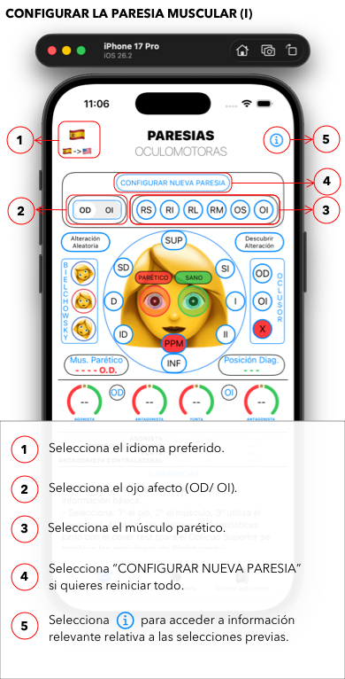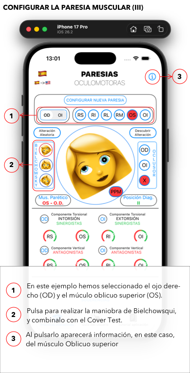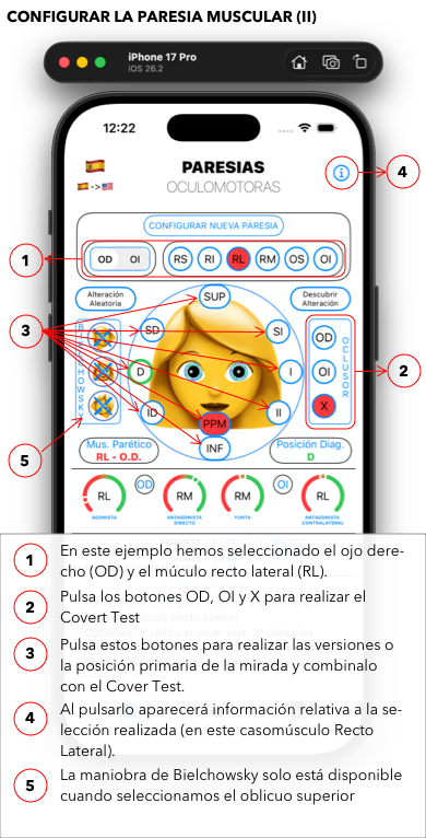 Es una App muy teórica y técnica en la que podréis, en un sujeto simulado, experimentar con las maniobras de Cover Test y de Bielchowsky (inclinación de la cabeza) el comportamiento de las paresias de los diferentes músculos extraoculares y sus interacciones con el resto de la musculatura extraocular de ambos ojos.