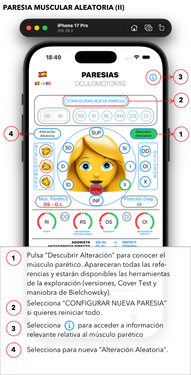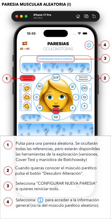 También vais a poder experimentar, como “reto personal”, el botón de la alteración aleatoria, en la que de forma aleatoria se programará una paresia muscular en cualquiera de los ojos. Verás como desaparecerán de tu vista las ayudas visuales pero tendrás disponible, para su exploración, tanto las maniobras de Cover Test y de Bielchowsky como a la vez la posibilidad de situar los ojos en las diferentes posiciones de la mirada. Pero no os preocupéis que dispondréis de un botón para descubrir la alteración que estáis explorando y seguir utilizando las ayudas visuales antes comentadas.